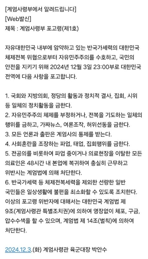 영장없이 체포, 구금, 압수수색에 처단한다 까지 다시 봐도 레전드 10새 내란포고문이네.